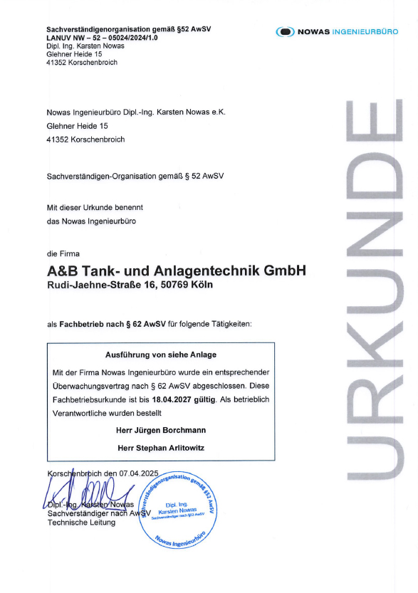 Wir sind als Fachbetrieb nach § 62 AwSV zertifiziert. Darüber hinaus nehmen wir in regelmäßigen Abständen an Fort- und Weiterbildungen teil und unterziehen uns Prüfungen und Zertifizierungen. Dies sichert Ihnen fundierte Kompetenz und ein Höchstmaß an Sicherheit.